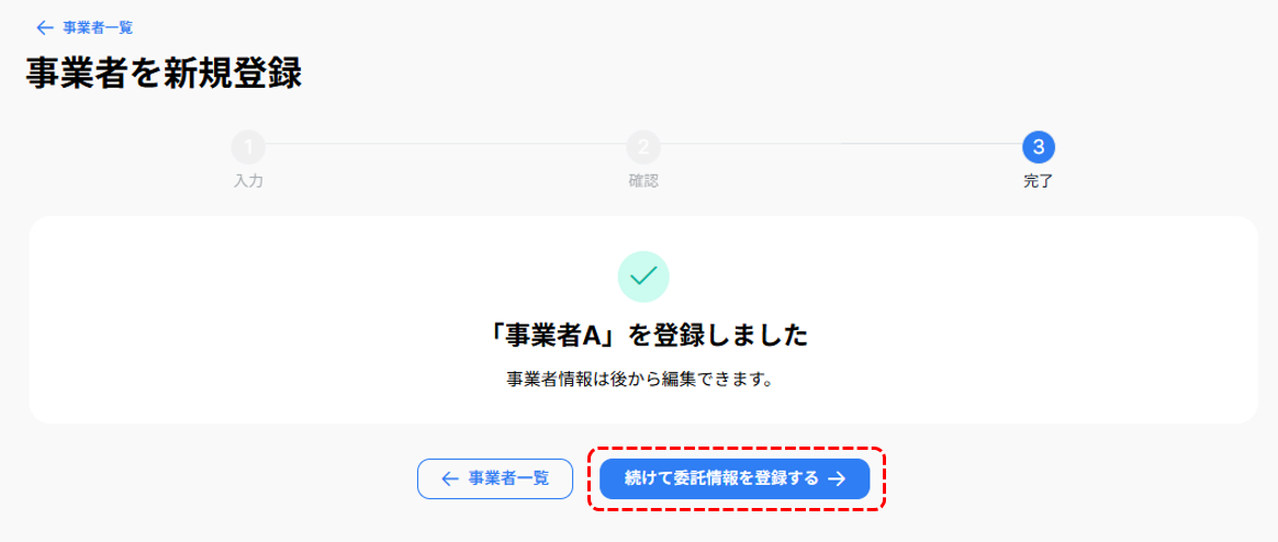 事業者登録完了後に引き続き委託先の「委託情報」の新規登録が可能です。