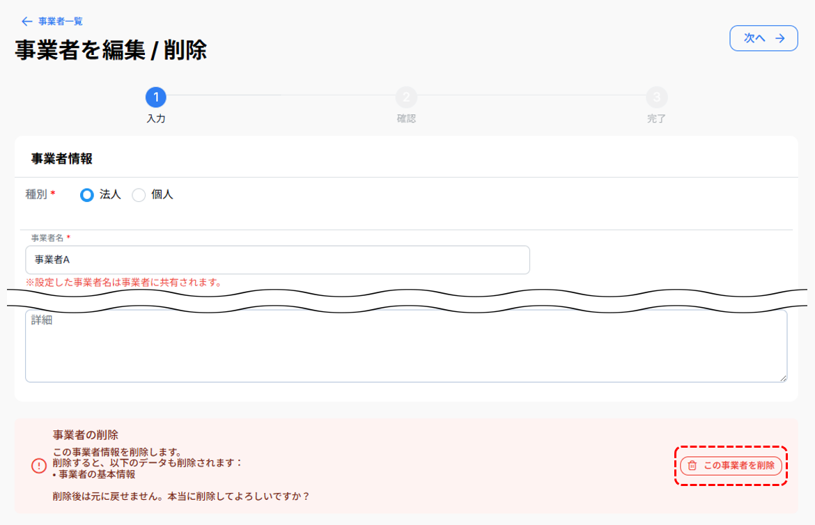 事業者の削除について 事業者情報の削除手順について、説明します。 画面左側メニューの【事業者】を開く。 削除する事業者の編集アイコンを押下。 編集画面のページ下部にある「削除する」ボタンを押下。 削除ダイアログに従い削除。