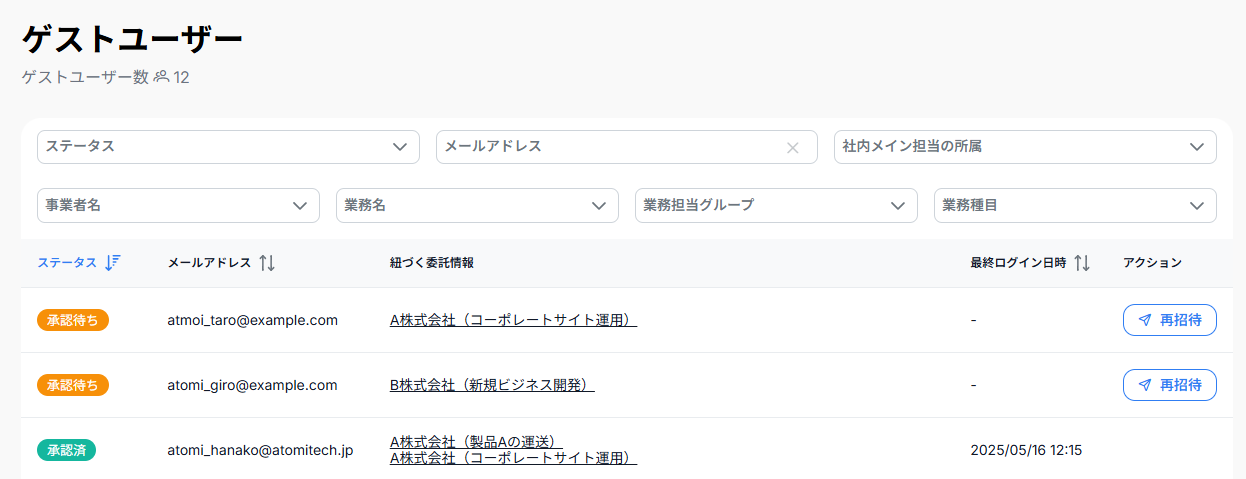 ※ ゲストユーザーの一覧から未承認ユーザーに対して、再招待メールを送信することができます。