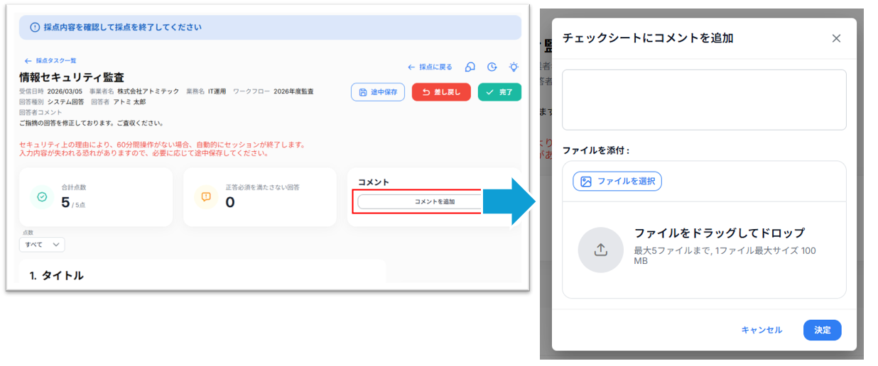 チェックシートの採点結果に対する全体コメントへファイルを添付できるようになりました。