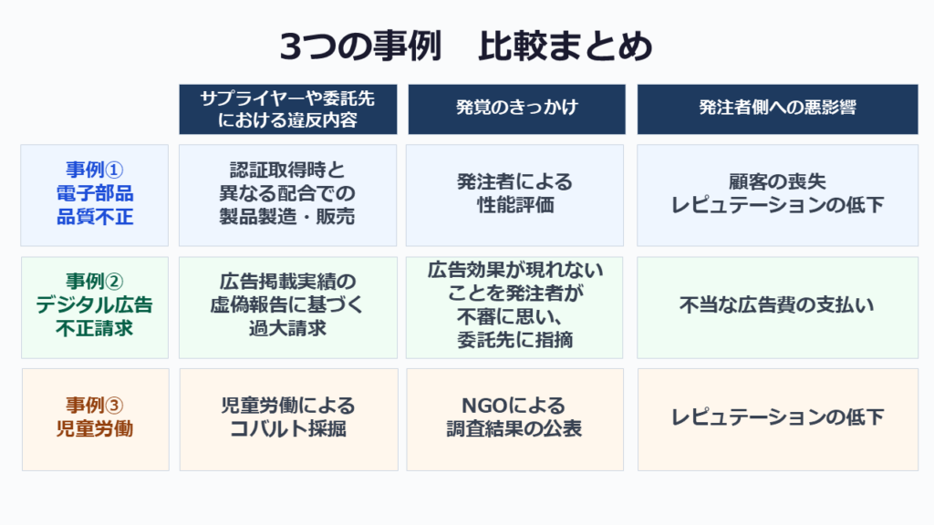 2 つめは、いずれも委託元が意図的に調査した結果ではなく、偶然気付いたことがきっかけで不正が発覚していることです。つまりバレなければもっと続いていた可能性が高く、委託元が相手先のコンプライアンス違反の有無を把握することの難しさを思い知らされる事例だと言えるでしょう。