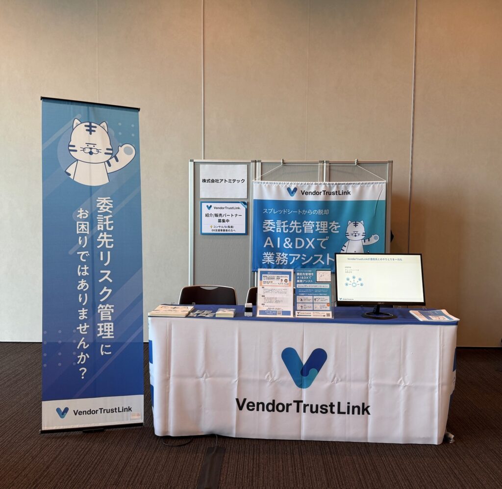 弊社ブースでは、本イベントのテーマでもある契約業務を「よりラクに、正確に」進めるための取り組みとして、契約締結後の委託先管理・リスク管理までを含めた契約業務の高度化をテーマに、委託先リスク管理ツール「VendorTrustLink」を活用した委託先管理のDX化・運用効率化の方法をご紹介しました。